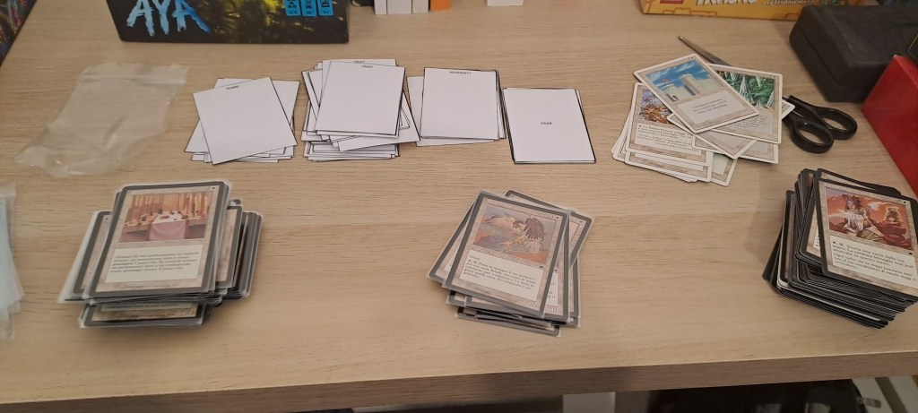 I pre-generated 10 playing characters (PCs) in order to allow the expected audience for some choices and quickly set-up the session. I used the card format, aided by the spoils of my (sold) Mtg collection*, sleeves and a printer.