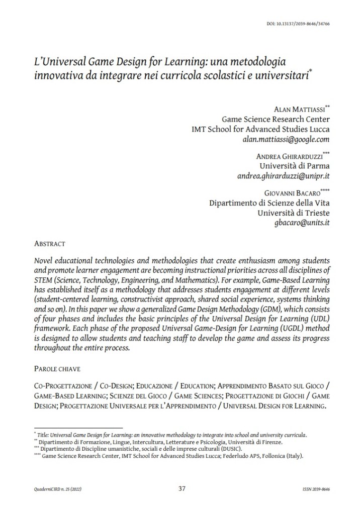 Assieme a Giovanni Bacaro e Andrea Ghirarduzzi abbiamo formalizzato questo approccio che abbiamo denominato Universal Game Design for Learning (UGDL) poiché applica i principi di inclusività ed accessibilità di Universal Design for Learning al Game-Based Learning, in particolare nella modalità di co-progettazione assieme ai discenti di giochi su temi curricolari.