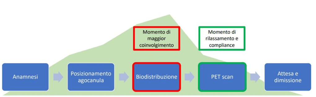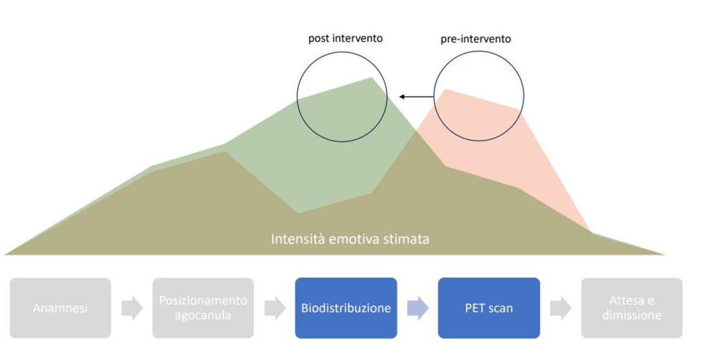 La situazione iniziale pre-intervento (esame PET) stimata vedeva un momento di alta agitazione durante l’esame, mentre il momento della biodistribuzione del liquido di contrasto immediatamente precedente risultava un tempo vuoto, lungo e noioso.